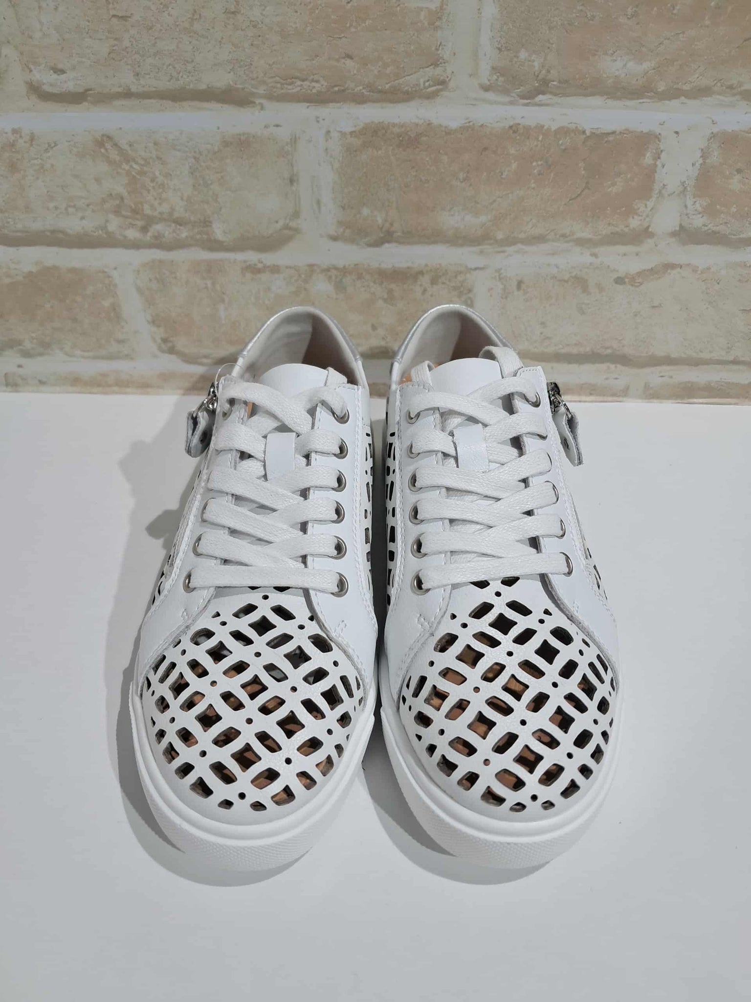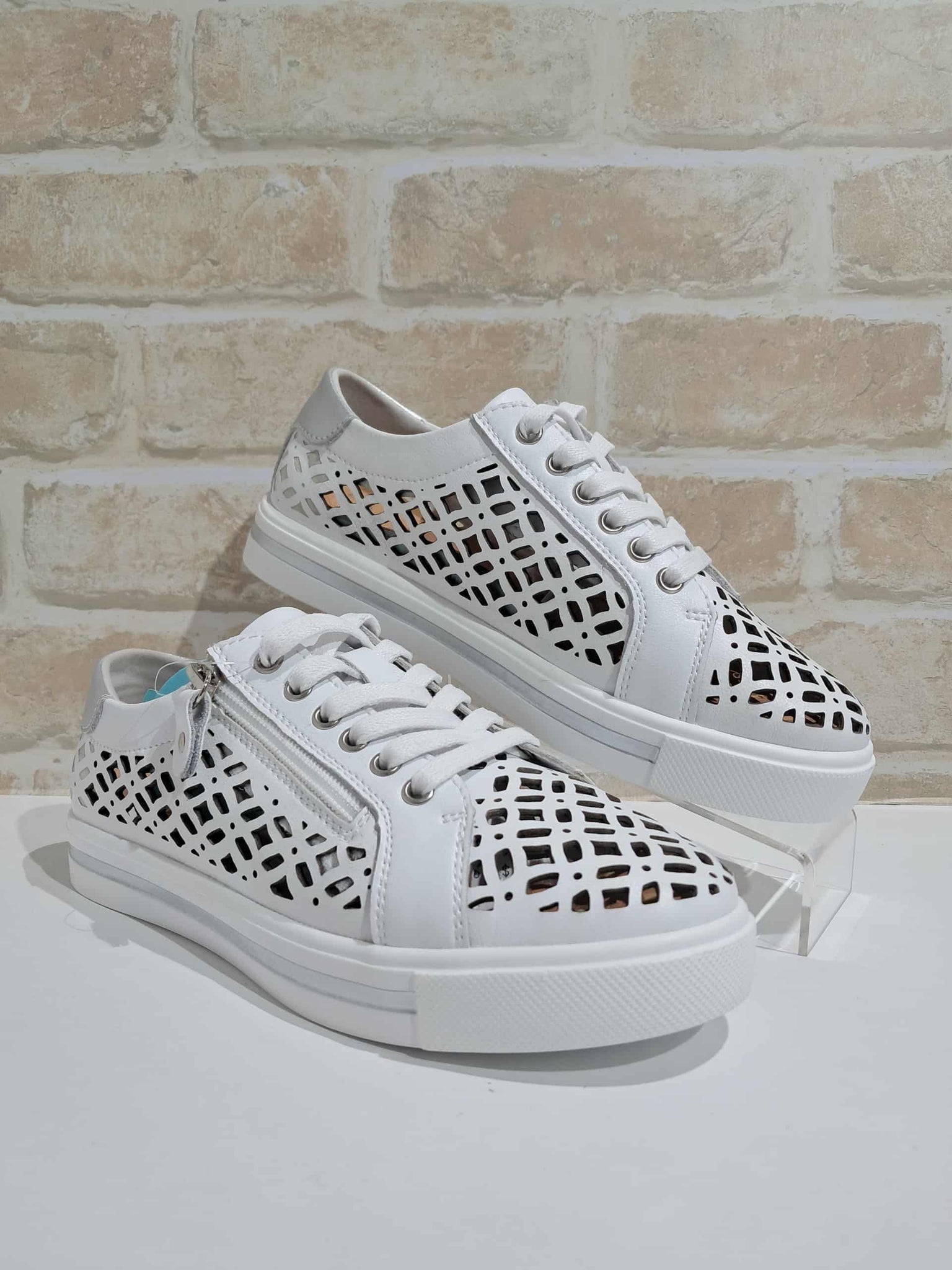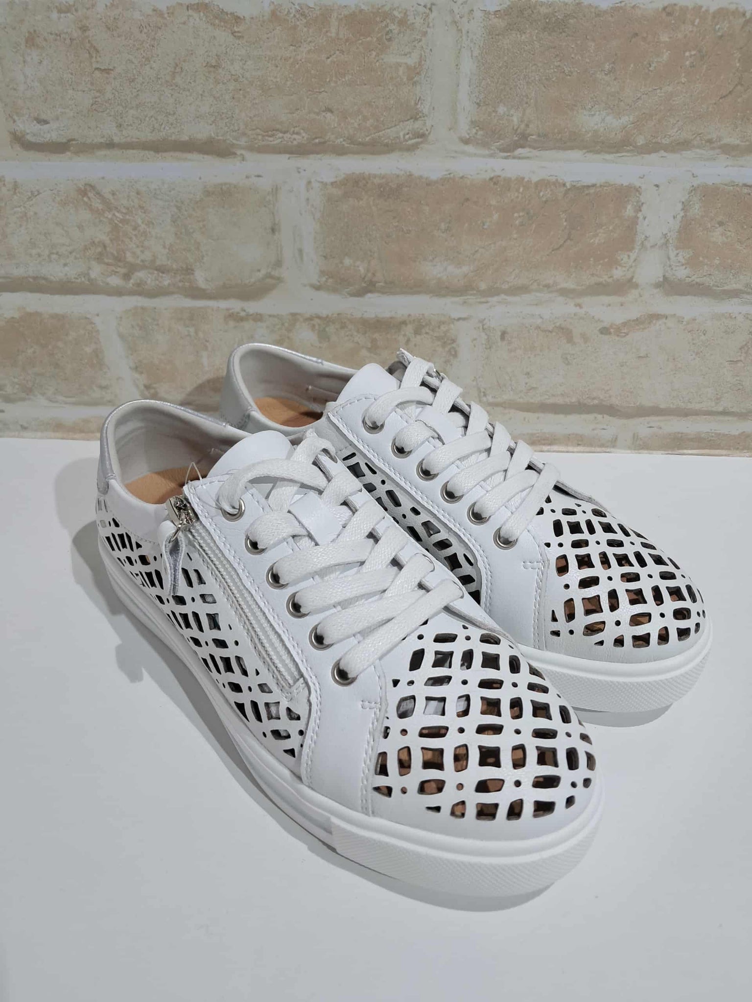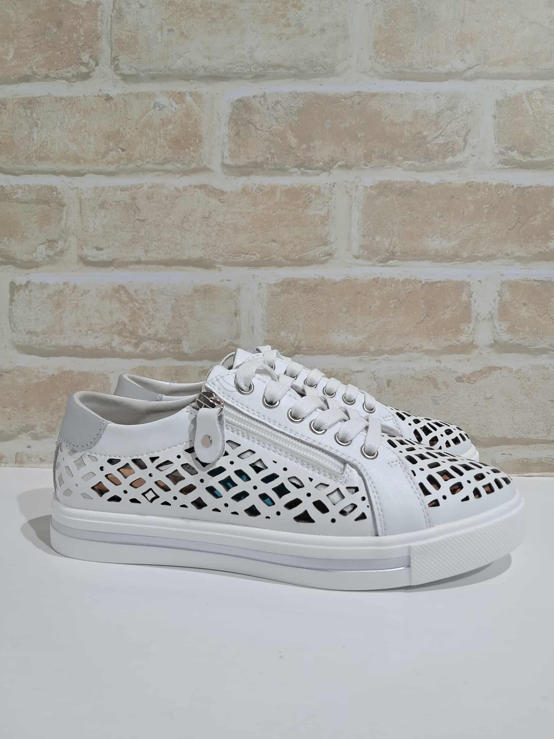 Fresh, crisp and on-trend this season, the Nova sneaker brings together everyday comfort with a fashionable cutwork design. Crafted from soft leather in white with subtle silver accents, the cut-out detailing adds polish while keeping the shoe breathable on warmer days. A functional side zip makes them easy to slip on and off, while the cushioned footbed ensures lasting comfort.