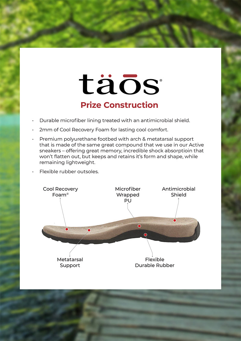 – Taos Soft Support™ premium footbed with Cool Recovery Foam® keep your feet cool, cushioned and comfortable all day long